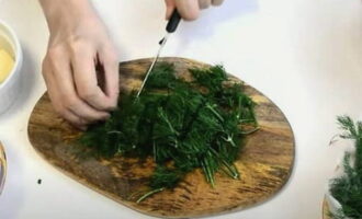 Промываем и обсушиваем зелень. Мелко нарезаем ее.
