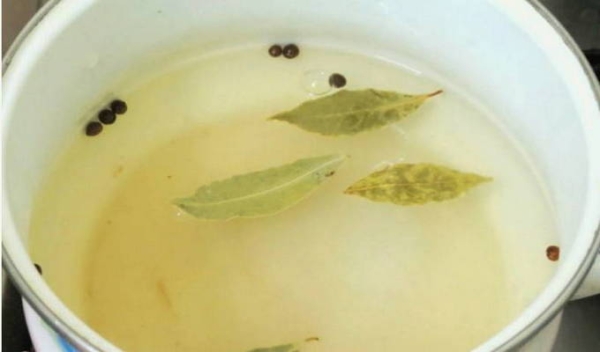 По истечении этого времени воду из банок через специальную крышку слить в кастрюлю. Растворить в ней указанное в рецепте количество соли с сахаром, насыпать приправы и пару минут поварить. Затем в маринад налить столовый уксус и огонь сразу выключить.