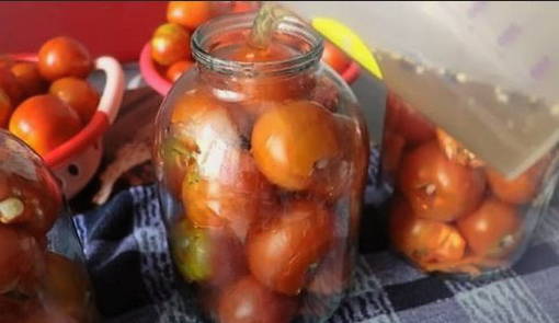 Хорошим вариантом консервации помидор на зиму будет у вас маринование их в собственном соку, что сохраняет выраженный вкус томатов, называемый «Пальчики оближешь». Рецепт требует больше времени и особенно вкусна заготовка, если у помидоров удалить кожуру. В томатный маринад добавляем только соль с сахаром и заготовку стерилизуем.