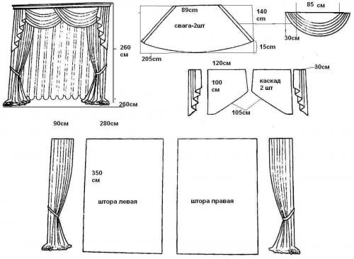 Пример 2.Схема выкройки шторы с ламбрекеном состоящего из двух сваг.
