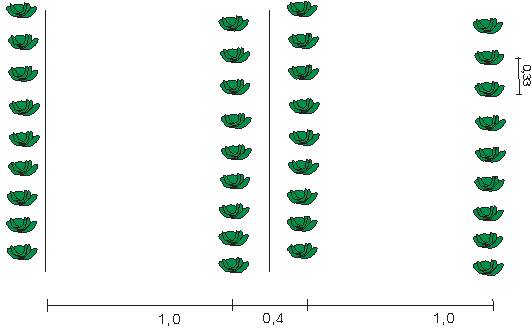 Пересадка капусты в открытый грунт осуществляется в зависимости от погоды через 40-50 дней после прорастания семян. Обычно кустики высаживаются в 2 ряда с расстоянием между рядами в 60 см, а между растениями в 30-40 см. В каждую лунку засыпаются удобрения в количестве 60-100 г древесной золы и столько же перегноя.