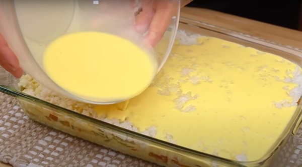 Разбиваем в отдельную миску яйца, смешиваем со сливками и солью, взбиваем. Выливаем яичную смесь на верхушку будущей запеканки.