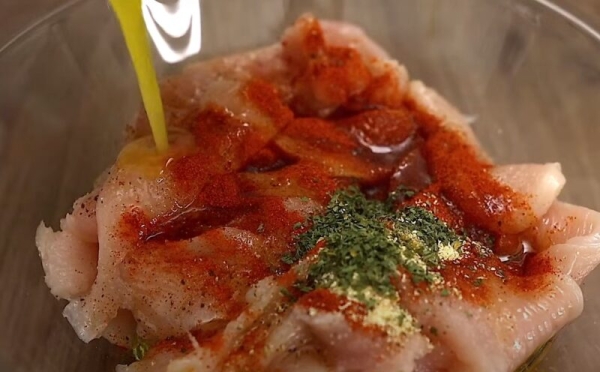 Нарезаем куриную грудку на тонкие пластины. Солим курицу, посыпаем черным молотым перцем, сладким перцем, сухим чесноком, сушеной петрушкой.