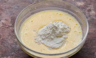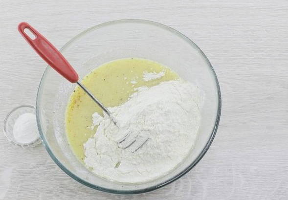 - Всыпаем в полученную смесь разрыхлитель теста. Он сделает выпечку пышной и аппетитной.
