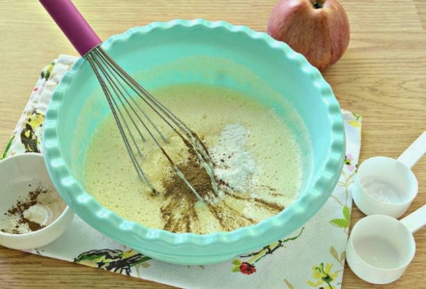 - Очищаем от кожицы и семян яблочные плоды. Измельчаем их небольшими кусочками. Выкладываем в тесто и размешиваем.