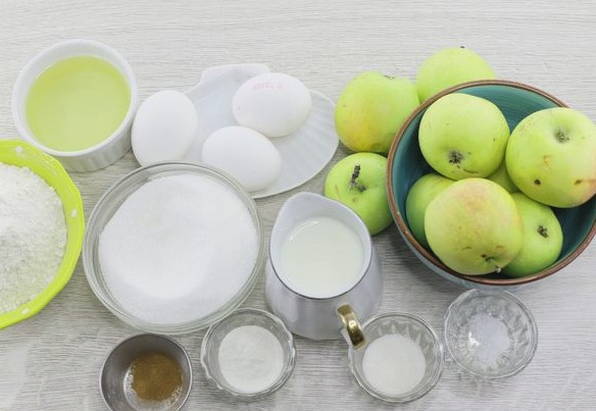 Как приготовить пышную шарлотку на кефире с яблоками в духовке? Достаем все продукты, упомянутые в списке.