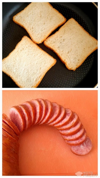 Берём ломтики белого тостового хлеба и слегка обжариваем на сухой сковороде без масла. Пока обжаривается хлеб, подготавливаем начинку. Ветчину или любую колбасу, у нас краковская, нарезаем тонкими кружочками.
