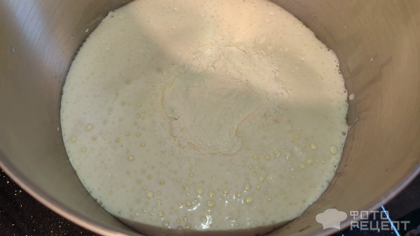 Далее в два-три приема добавляем муку и жидкость, пока не закончится весь объем.
