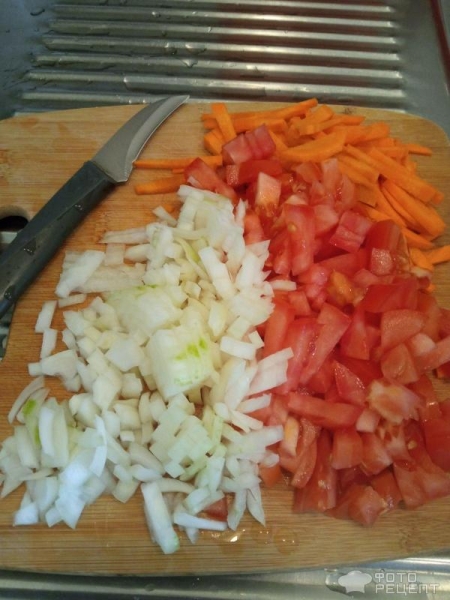 Пока свинина немного обжаривается, моем и режем овощи. Я предпочитаю морковь порезать брусочками. Но можно и на крупной терке потереть. Лук и помидор режем.