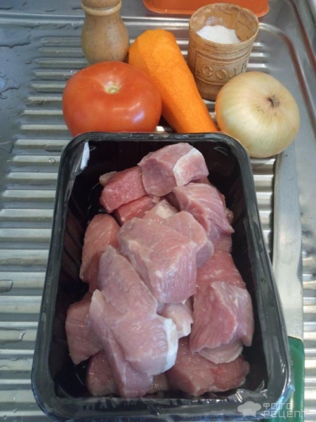 Итак, берем свинину. У нас сегодня полуфабрикат — порезанное кусочками для тушения филе. Еще нам понадобится простой набор овощей и специй.