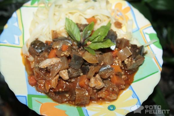 Готовое куриное филе с баклажанами подаем к столу, украсив его веточкой свежего базилика. Мне в качестве гарнира к такому блюду нравится использовать пшеничную лапшу.