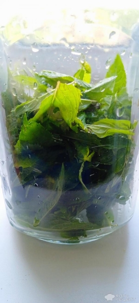 Нам понадобится пять веток мяты, точнее только листики от пяти веток. Нужно отделить их от стебельков и промыть. Воду хорошо стряхнем.