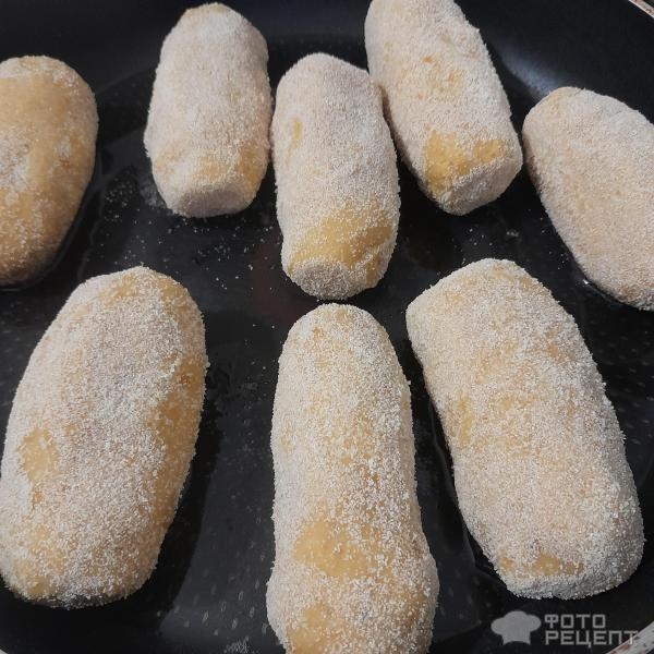 Готовые палочки обваливаем в манной крупе или муке и выкладываем на сковороду с разогретым растительным маслом.