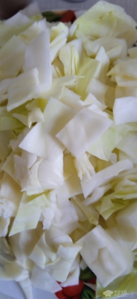 Теперь берём кастрюльку, в которой будем тушить наше рагу и на дно выкладываем половину всей капусты.