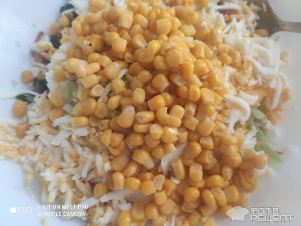 салат. Добавляю три столовых ложки консервированной кукурузы.