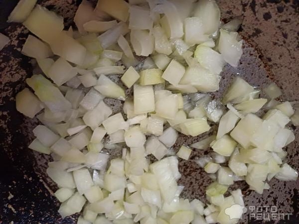 Луковицу очищаю и нарезаю квадратиками не большого размера. Нарезанный лук отправляю в сковороду с кипящим рафинированным маслом.