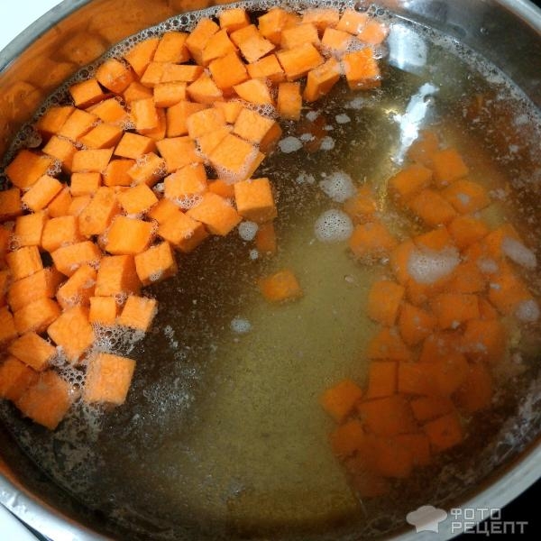 Морковь нарезаем кубиками среднего размера. Можно и на тёрке натереть. Но у меня все дети очень любят морковку, в том числе и варёную. Поэтому я нарезаю кубиками. Отправляем морковь в бульон.