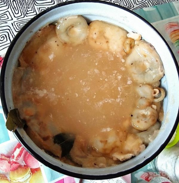 Затем закрываю грибы подходящей тарелкой или крышкой и сверху груз. Обычно это наполненная водой трехлитровая банка. Фото есть в отзыве Грузди и рыжики соленые.