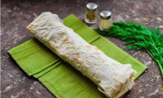 Шаг 4. Сворачиваем лаваш в рулет и оборачиваем полуфабрикат в пищевую пленку, кладем в холодильник на 2 часа.