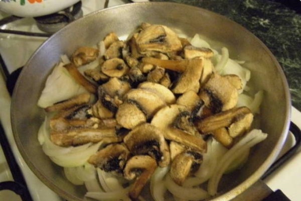 Шаг 3. В сковородку наливаем растительное масло, прогреваем и обжариваем на нем лук с шампиньонами до испарения влаги и легкой золотистости. Посыпаем зажарку ароматными травами, солью и перцем.