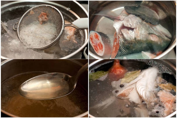Шаг 1. Если вы используете для варки бульона рыбные головы, то из них необходимо удалить жабры. Залейте рыбу холодной водой и поставьте на огонь. Варите рыбный бульон на медленном огне в течение 25 минут.