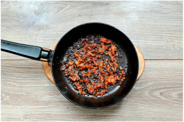 Шаг 4. В отдельной сковороде или кастрюле с толстым дном обжарьте измельченные овощи на растительном масле в течение 5-7 минут.