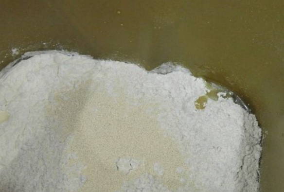 - Всыпаем сухие дрожжи. Их обязательно отправляем на горку сухих ингредиентов. Включаем режим для выпечки на 2 часа 50 минут. Устанавливаем вес 750 грамм и среднюю корочку.