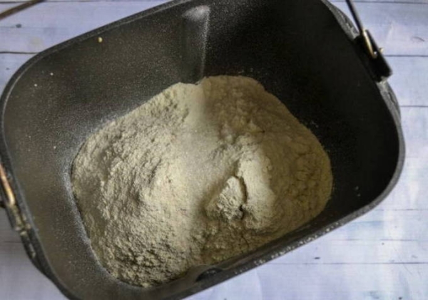 - Просеиваем два вида муки, соединяем их вместе и погружаем в ведерко хлебопечки.