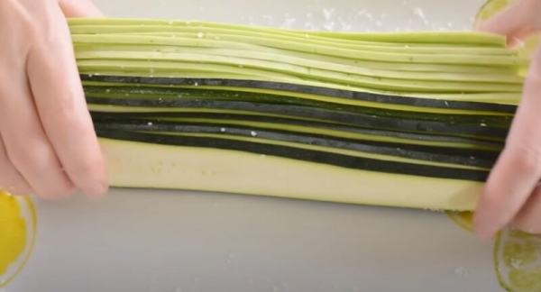 Нарезаем кабачки вдоль тонкими полосками, целые полоски посыпаем солью и оставляем на 10 минут.