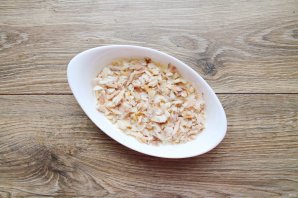 Картофель очистите от кожуры и натрите на крупной терке. Выложите картофель ровным слоем на дно салатника и смажьте майонезом.