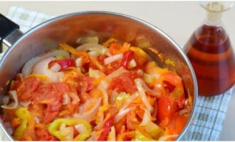 Шаг 5. Овощное ассорти, включая кашицу из томатов, а также соль, сахар, уксус и подсолнечное масло – перемешиваем и варим на протяжении 15 минут после закипания.