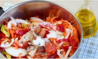 Шаг 7. Компоненты посыпаем сахарным песком, перцем, солью, также обязательно вливаем уксус и подсолнечное масло.