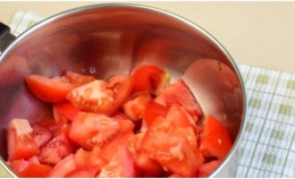 Шаг 1. Спелые помидоры режем на достаточно крупные дольки.