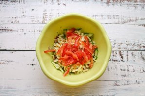 Помидор порежьте средней соломкой, удалите семена, добавьте в салат. Помидорный сок с семенами выложите в другую миску.