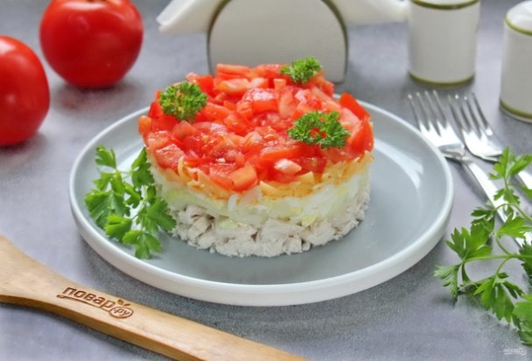 Салат "Маринара" готовится слоями. Все очень просто и быстро. Необыкновенно сытный и вкусный салат, рекомендую!