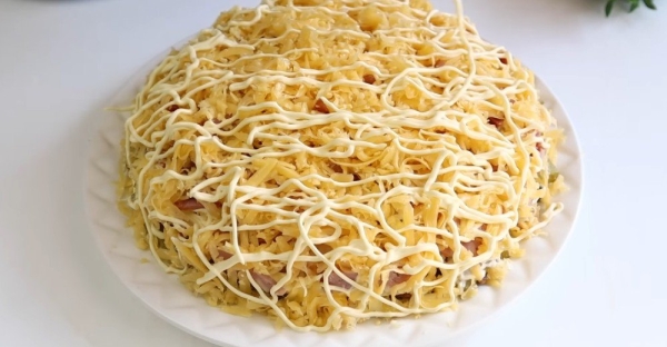 Помимо того, что это блюдо выходит очень аппетитным, оно еще может похвастаться особой питательностью. Ведь в него входят яйца, грибы, сыр и два вида мяса: отварная куриная грудка и копченая колбаса.