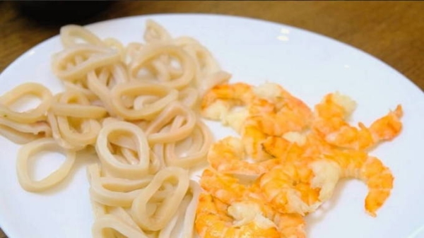 Шаг 1. Крупные креветки варим три минуты в кипятке, мелкие тушки кальмаров – одну минуту. Ингредиенты остужаем и обсушиваем, нарезаем.