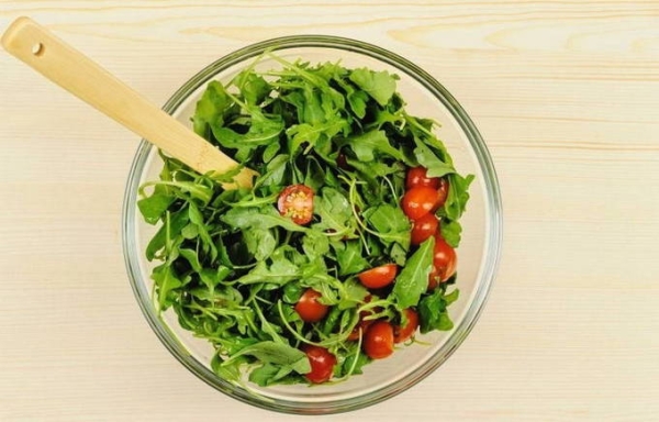 Шаг 7. В салатнике объединяем руколу, морепродукты и черри – поливаем заправкой.