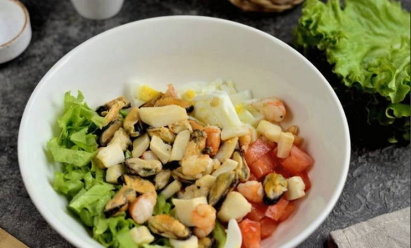 Очень вкусный салат из морепродуктов с креветками и кальмарами