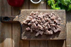 Уже отваренную говядину нарежьте маленькими кубиками.