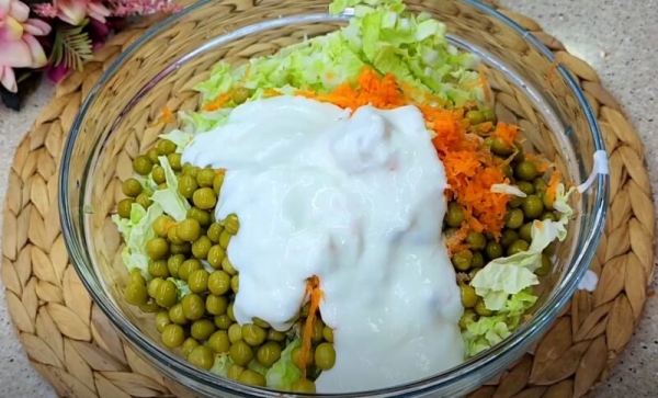 Шинкуем мелко пекинскую капусту, высыпаем в салатник вместе с консервированным горошком. Натираем на мелкой терке очищенную морковь и зубчик чеснока, кладем в салат.