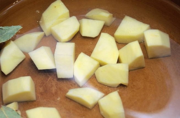 Шаг 2. Картофель очищаем и разделываем на небольшие кубики. Выкладываем в кастрюлю и заливаем водой. Сюда же добавляем лавровые листья и немного соли.