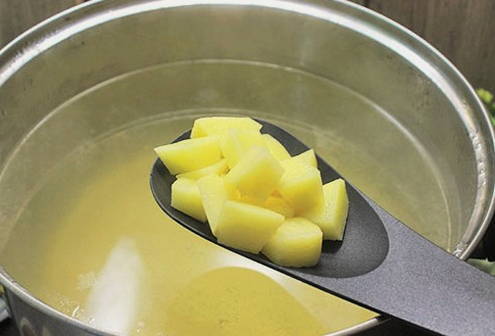 Шаг 1. Очищаем картофель от кожуры, промываем его под водой и разделываем на небольшие кубики для супа. Погружаем картофель в кипящую воду или бульон. Варим около 10 минут в кипящей жидкости до размягчения.