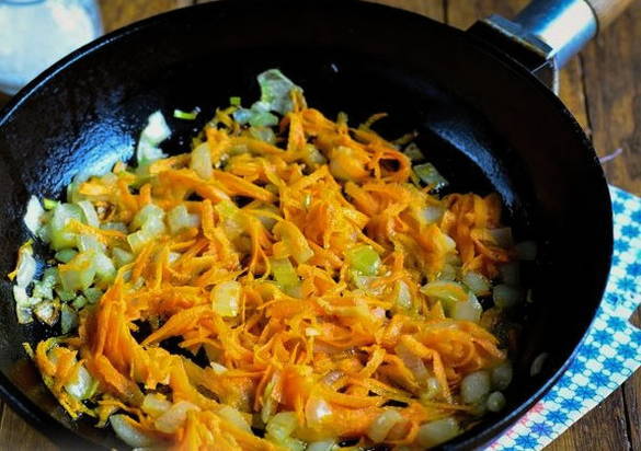 Шаг 1. Измельчаем репчатый лук и натираем на терке морковь. Обжариваем овощи на растительном масле до мягкости.