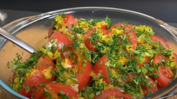Нарезаем дольками помидоры и кладем ⅓ их часть на дно глубокого салатника. На верхушку помидор выкладываем массу из перцев, посыпаем ее зеленью, поливаем соусом.