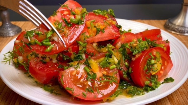 Слой зелени накрываем второй частью помидор, повторяем очередность слоев перца, зелени и соуса. Так формируем три слоя для закуски, убираем ее в холодильник на пару часов.