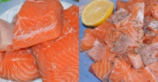 - Филе семги отделите от кожи при помощи острого ножа. Освободите его от костей. Нарежьте мясо рыбы кубиками средней величины. Сильно не мельчите! Посолите и поперчите рыбу, сбрызните лимонным соком. Оставьте филе на 30 минут промариноваться. Далее разогрейте на сковороде оливковое масло. На нём обжаривайте кусочки рыбы со всех сторон в течение 5 минут. Должен образоваться легкий румянец. Теперь перелейте в сковороду сливки комнатной температуры.