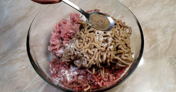 - Глубокую миску наполните остывшей кипяченой водой. В ней замочите черный или ржаной хлеб. Пока он размокает, смешайте оба вида фарша. К ним добавьте лук, пропущенный через мясорубку или измельченный блендером.