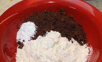 Шаг 5. В миску пропускаем через сито муку, какао и разрыхлитель. Размешиваем. Количество какао зависит от желаемого вкуса. Чем больше какао, тем насыщеннее вкус.