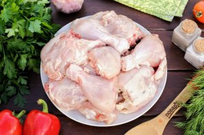 Мясо нарежьте средними кусочками. У меня курица, я использовала спинки и голень. Голень оставила целыми, а спинки порубила пополам. Кожу сняла, но можете её оставить, особенно если у вас курочка домашняя.
